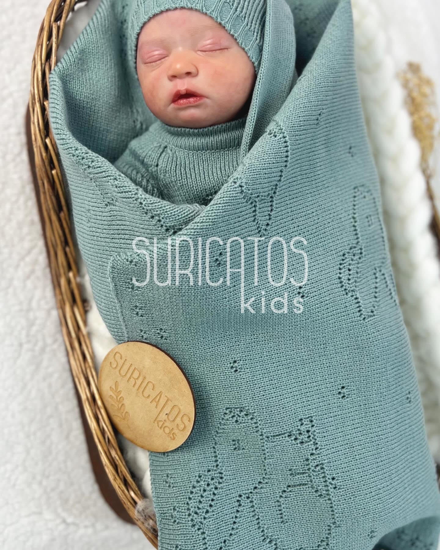 Tierna y suave manta tejida con muchos conejitos tiernos en pequeños huequitos, una manta super funcional que podrás llevar a cualquier parte por ser liviana y calientita.